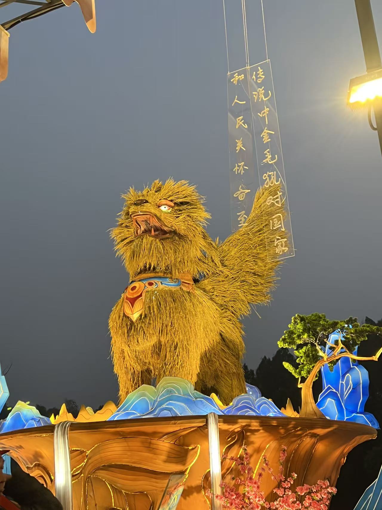 最终,200多斤稻草在彩灯工匠的巧手下,变成了一只雄赳赳气昂昂的金毛吼,一堆10立方的泡沫变成了一只插着翅膀昂首欲飞的白泽,6000多根扭扭棒被扭成了一只金光闪闪的貔貅。